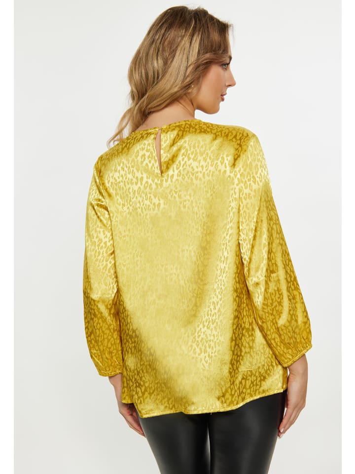 Улучшите свой гардероб с помощью жаккардовой блузки Leo с ярким животным принтом. V-образный вырез, вырез на спине на пуговицах и золотая цепочка спереди добавляют элегантности. Длинные рукава с тонкими буфами и эластичные манжеты создают шикарный силуэт. Эта блузка, выполненная из роскошной ткани с мягким блеском, обеспечивает непринужденную посадку, стильную привлекательность и идеально подходит для придания нотки остроты вашему весеннему гардеробу. Этот продукт является частью коллекции Animal Print Collection
