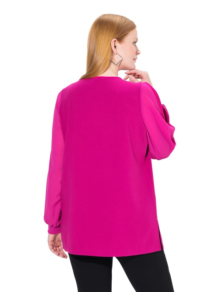 Туника А-силуэта с V-образным вырезом. Изюминка: Длинные рукава из прозрачного шифона со складками, в том числе на плечах. Эластичные сборчатые концы. Карманы в боковых швах.