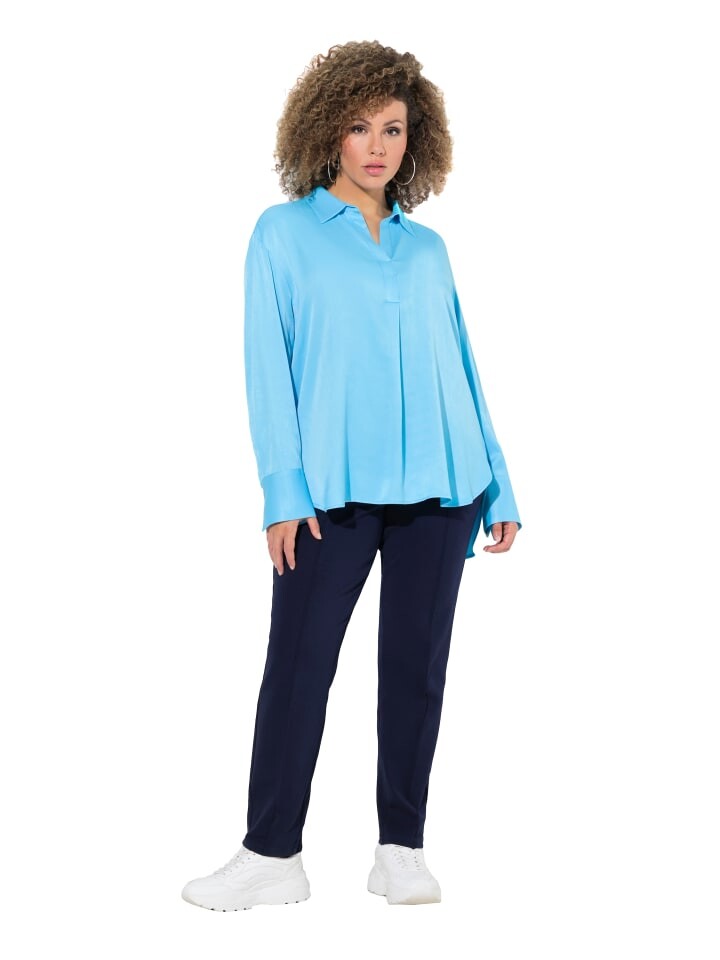 Блуза-туника удобного кроя из мерцающего атласа. Воротник рубашки с V-образным вырезом и декоративными складками. Длинные рукава с манжетами. Закругленный низ, удлиненный сзади.