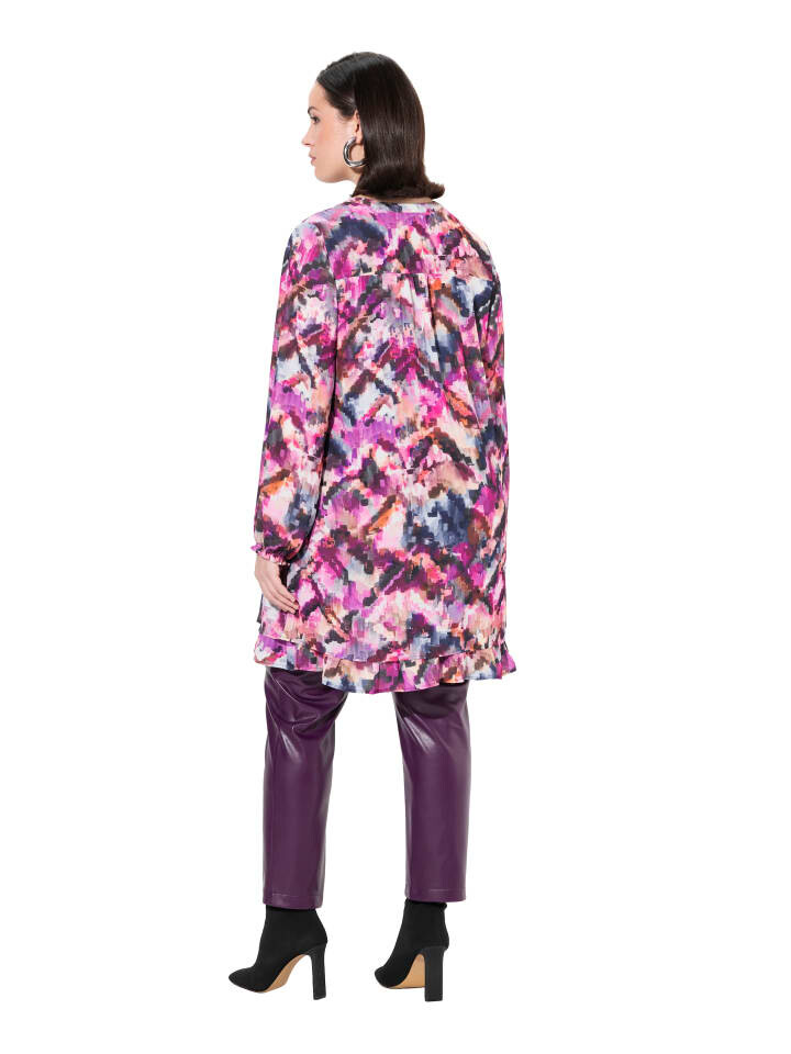 Длинная туника, удобного кроя, с пиксельным рисунком. Вырез туники с планкой на пуговицах, длинные рукава с эластичными манжетами со сборками. Непрозрачная подкладка основной части - слегка удлиненный низ с видимой воланом.