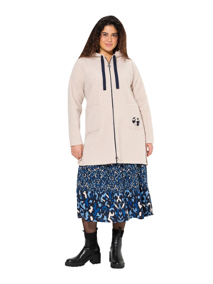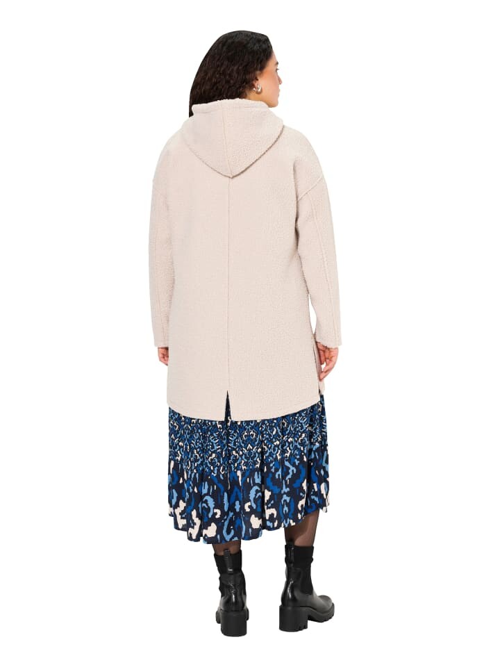 Длинная плюшевая куртка оверсайз из уютного флиса Тедди с видимыми швами. Капюшон с завязками, перекрытие плеч, молния. 2 накладных кармана, слева сердечко. Длинные рукава, боковые разрезы для еще большей свободы движений.