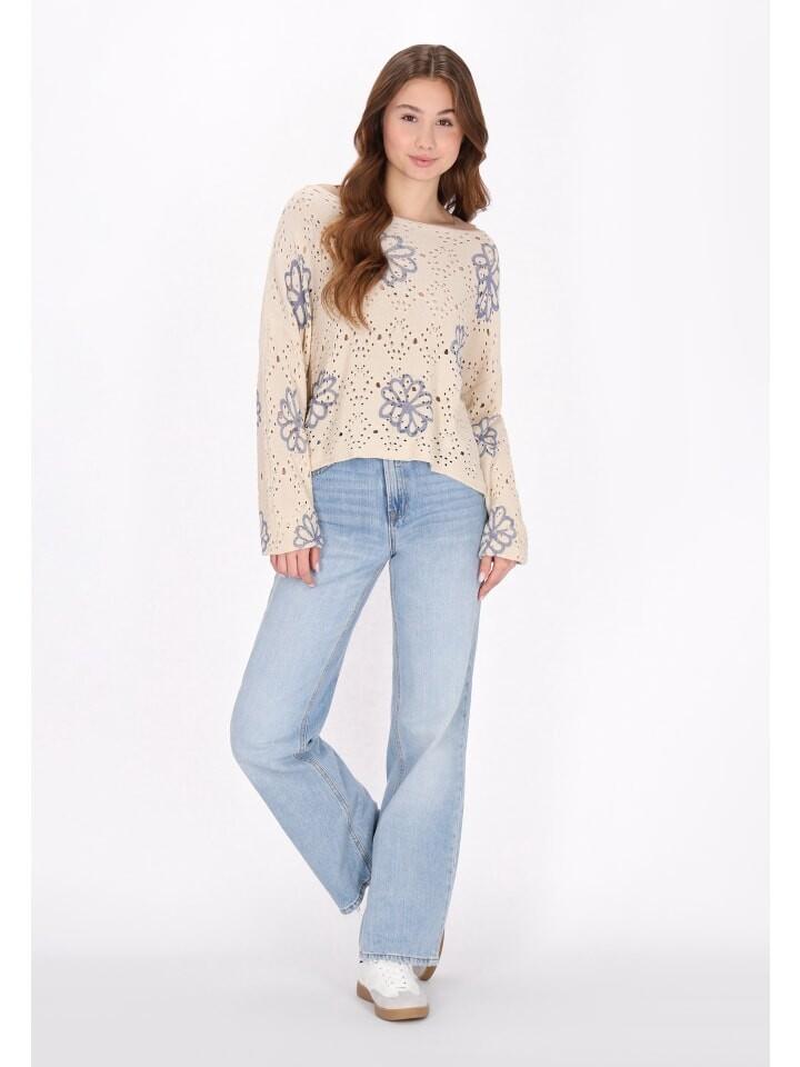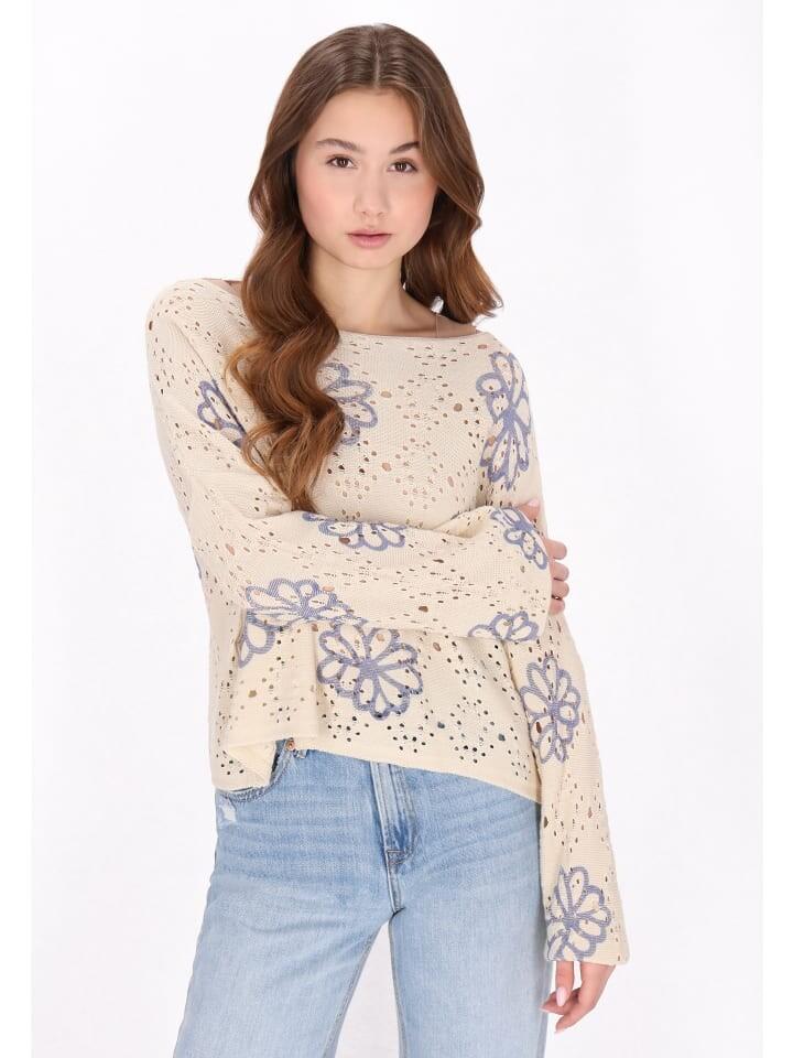 Побалуйте себя уютным очарованием этого укороченного свитера свободной посадки и вырезом-лодочкой с открытыми плечами, создающим непринужденную атмосферу. Это вязаное изделие с длинными рукавами, придающими нотку женственности, украшено цветочными принтами и ажурными деталями, создавая молодежный образ. Идеально подходит для удобной коллекции, идеально подходит для посещения школы или любого повседневного случая. это квартира из коллекции Comfy.