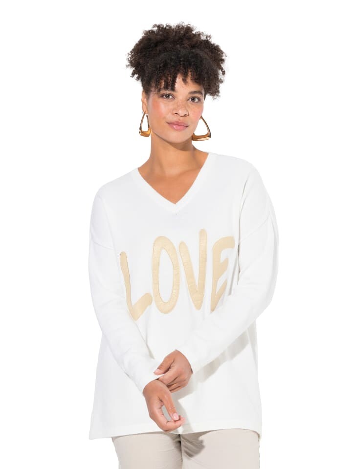 Пуловер свободного кроя из мягкой тонкой вязки с надписью LOVE. V-образный вырез, заниженная линия плеча, длинные рукава. Закругленный низ, удлиненный сзади.