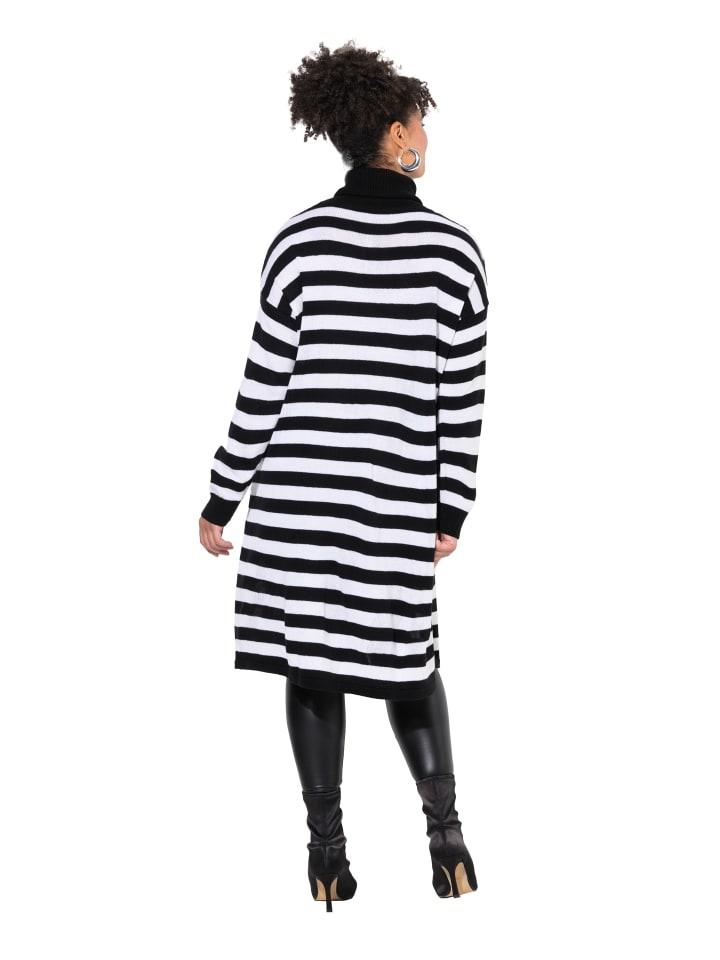 Длинный свитер А-силуэта из приятного мягкого полосатого трикотажа с длинным разрезом спереди по краю. Воротник стойка, заниженная линия плеча, длинные рукава с ребристыми манжетами.