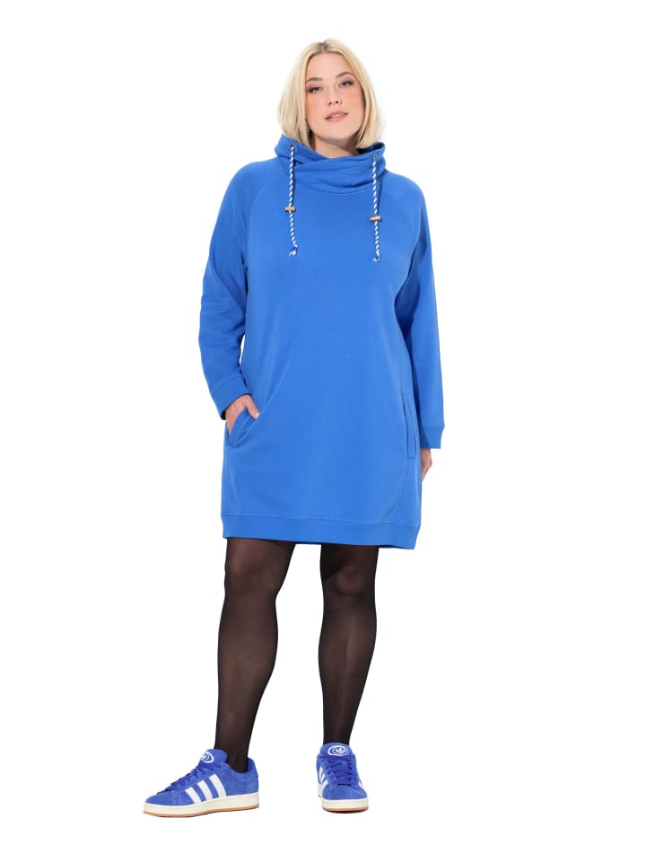 Платье-свитшот с широким воротником-стойкой и завязывающимся ремешком. Карманы в боковых швах, удобные длинные рукава реглан. Ребристые манжеты.