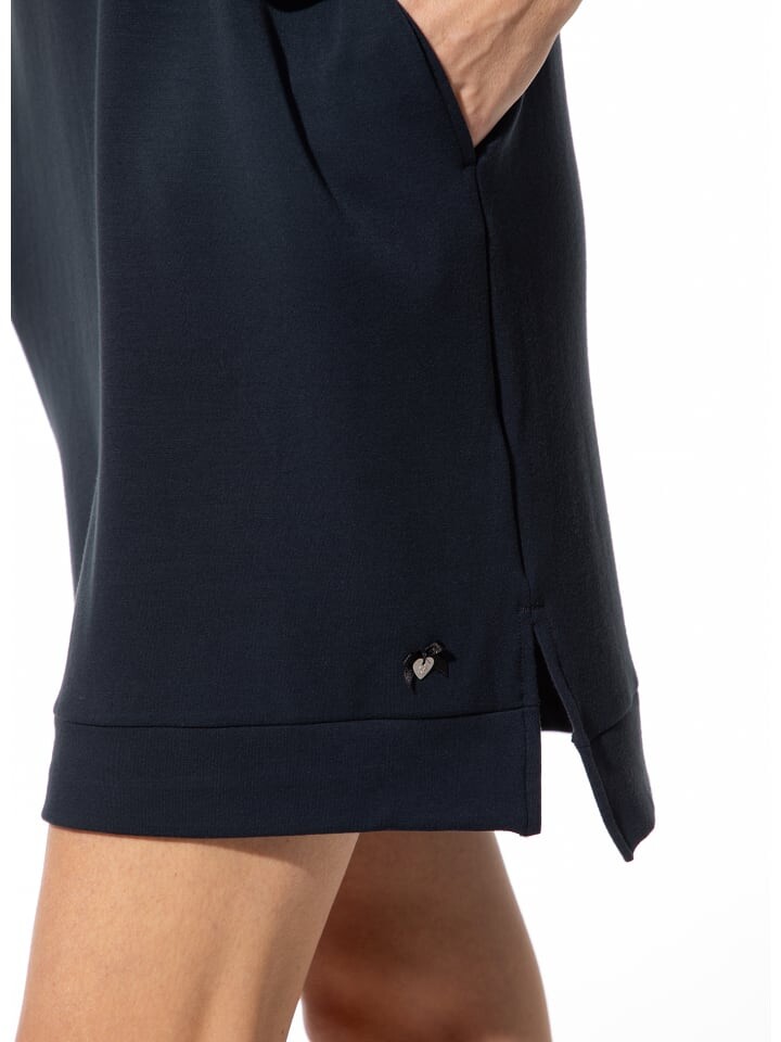 Это темно-синее платье-толстовка из нашей коллекции домашней одежды сочетает в себе комфорт и стиль. Прямой крой и разрезы по бокам придают платью повседневный силуэт и обеспечивают удобство в ношении. Спортивные манжеты на рукавах, вырезе и подоле завершают дизайн. Платье, изготовленное из высококачественного материала для подводного плавания, обеспечивает надежную стойку и сохраняет стабильные размеры. Состав материала, состоящий из 72 % вискозы, 20 % полиэстера и 8 % эластана, обеспечивает ощущение мягкости. Идеально подходит для расслабляющих дней дома.