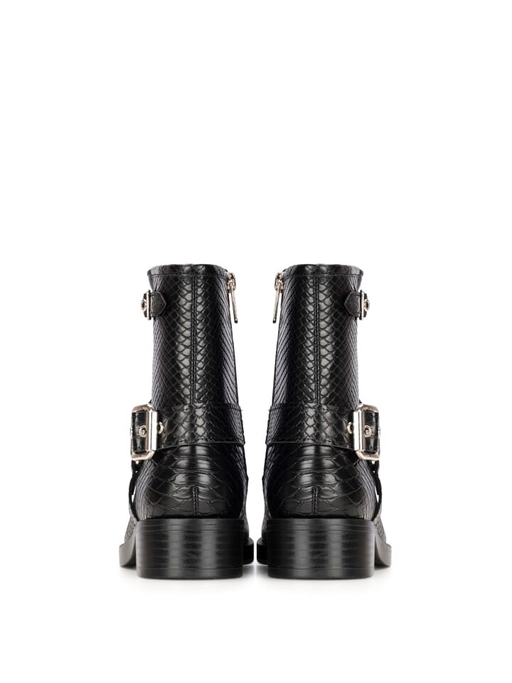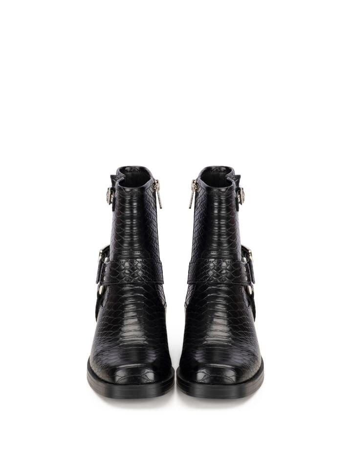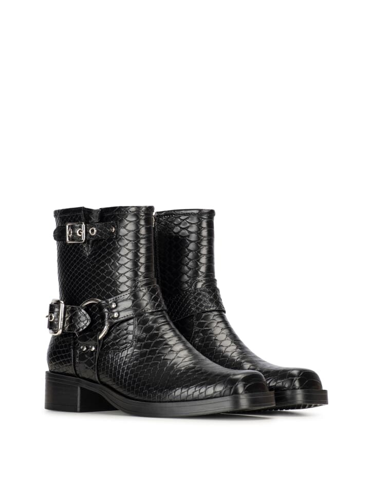 Женские байкерские ботинки PHOEBE от POSH от Poelman имеют черный верх из искусственной кожи со змеиным принтом. Модель имеет блочный каблук высотой 4 сантиметра и прочную стельку. Эти байкерские ботинки станут дополнением вашего гардероба!