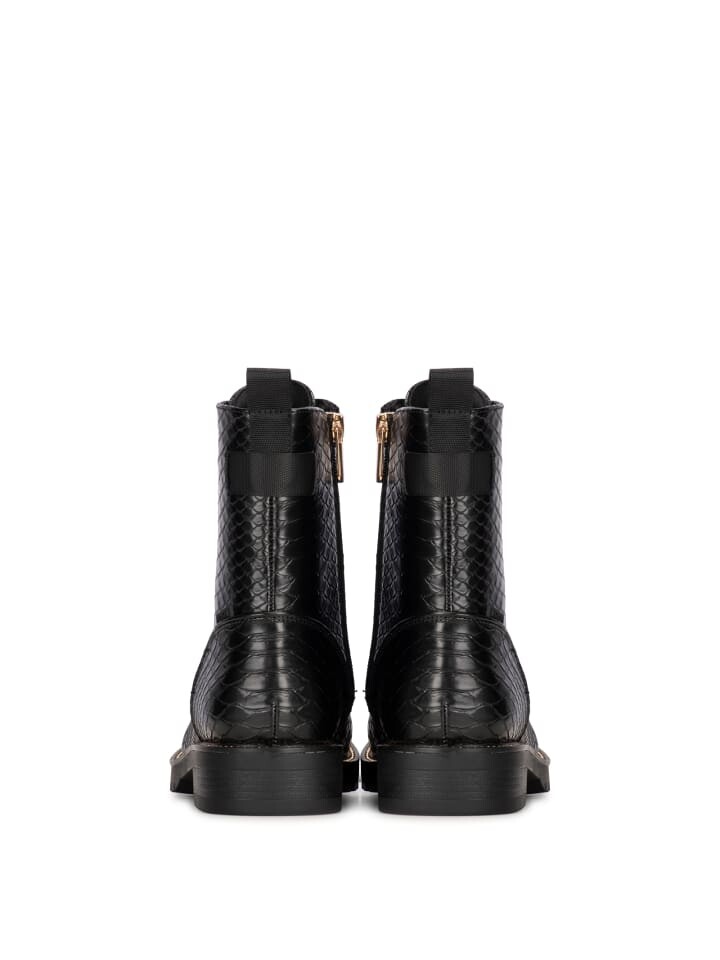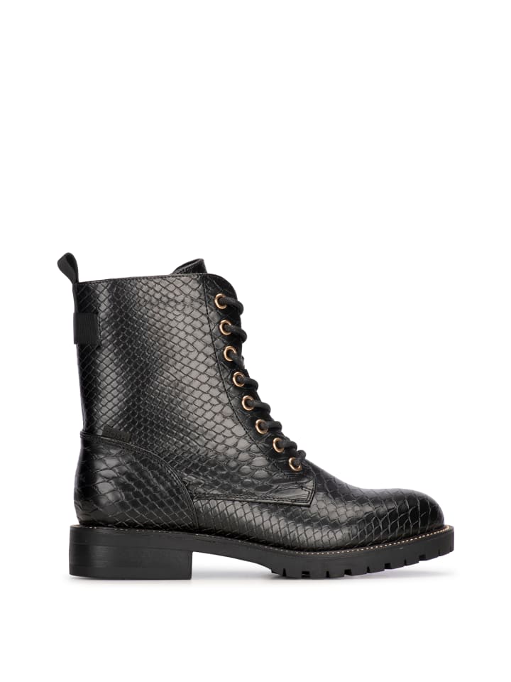 Женские ботинки на шнуровке "KIEK" от POSH by Poelman имеют верх из искусственной кожи черного цвета со змеиным принтом. Модель оснащена внутренней молнией. Подкладка выполнена из микрофибры, ботинок имеет застежку. прочная стелька из искусственной кожи. Прочные детали серебристого цвета придают ботинкам женственный вид и очень модны. Их также можно прекрасно сочетать с длинным платьем, юбкой или узкими джинсами!