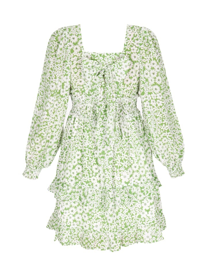 Модное мини-платье создано для юных модниц. Оно имеет элегантный квадратный вырез и длинные рукава, а также классический крой, подходящий любому типу фигуры. Сзади имеется декоративная окантовка. Эластичный пояс обеспечивает комфорт, а тканый цветочный узор добавляет очарования. Идеально подходит для школьных занятий или повседневных прогулок, это незаменимая вещь весной и летом! Это часть Летней коллекции.