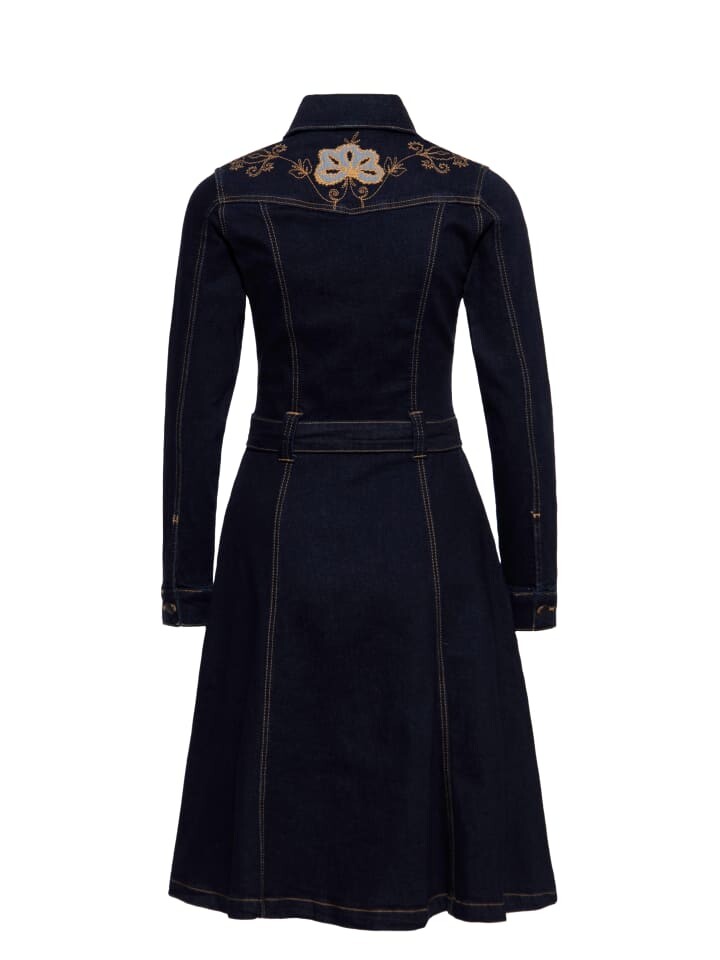 Это джинсовое платье от Queen Kerosin сочетает в себе настоящий вестерн-шарм с женственностью! Прочный джинсовый материал с содержанием эластана обеспечивает комфортную свободу движений, а силуэт А-силуэта и расклешенная юбка в стиле свободный придают платью живость на каждом шагу. Западный образ приобретает элегантность благодаря художественной вышивке на плечах и воротнике. Декоративный съемный ремень подчеркивает талию, а контрастная декоративная строчка и прочные металлические пуговицы идеально дополняют дизайн. В сочетании с ковбойскими сапогами это платье станет настоящей винтажной изюминкой!