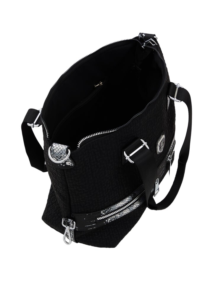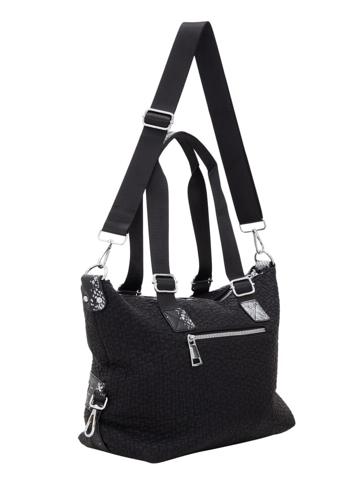 Представляем нашу структурированную большую сумку с яркой эмблемой спереди. Две ручки для переноски регулируются благодаря металлической фурнитуре. Эта сумка также имеет внешние карманы на молнии и отделку с уникальным рисунком. Заплатки с симметричным рисунком и мелкие металлические детали добавляют эстетической привлекательности. Эта сумка с просторным внутренним пространством и множеством отделений идеально подходит для любого случая.