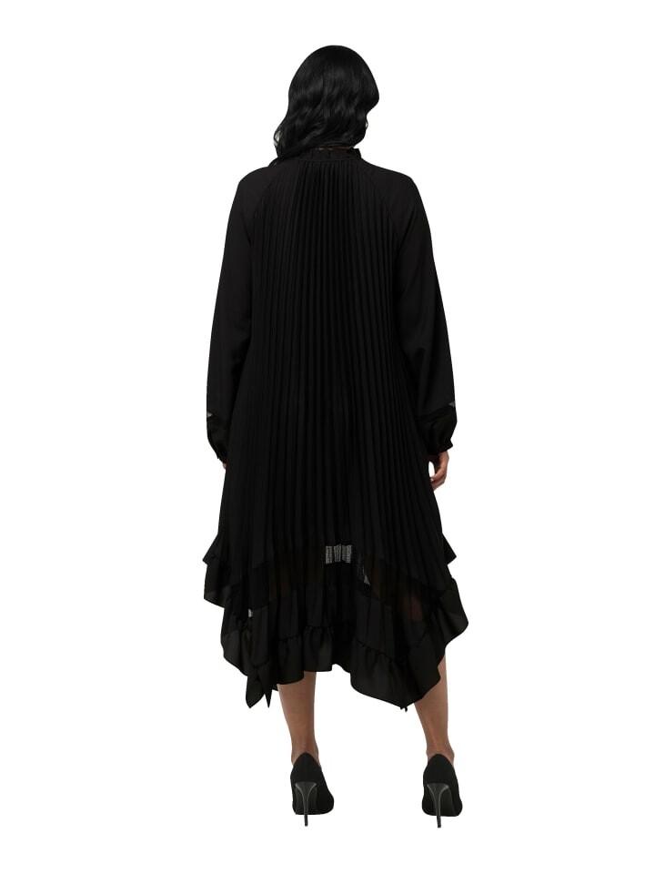 Плиссированное платье А-силуэта. Изюминка: закругленный низ с кружевными вставками и воланами. Воротник с оборками, разрезом и ремешком. Гладкие длинные рукава реглан с кружевными полосками и узкие манжеты с обтянутой пуговицей.