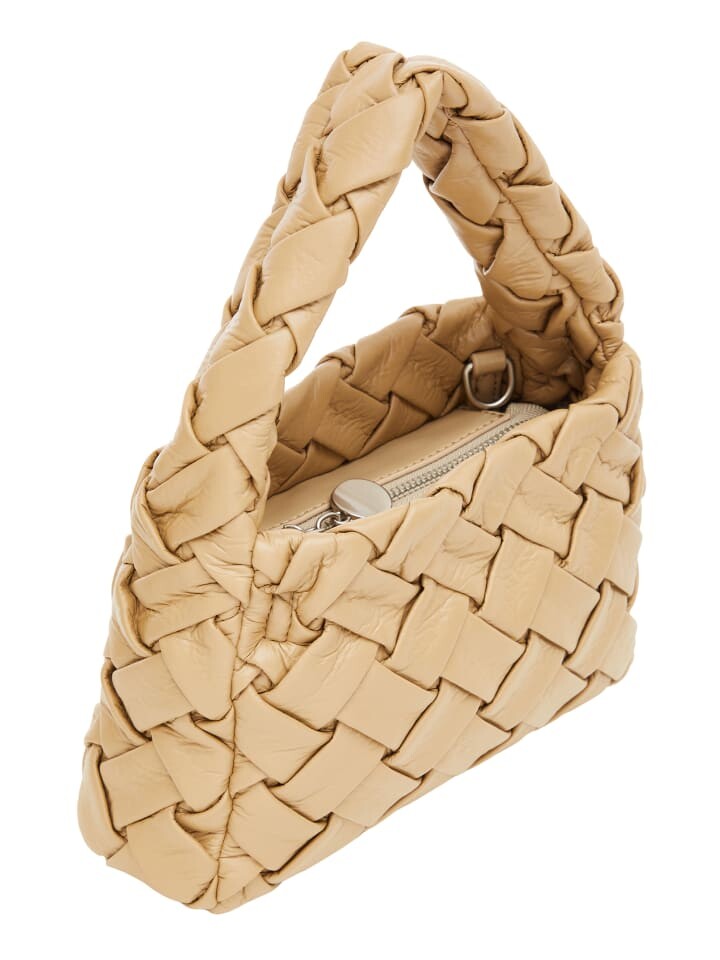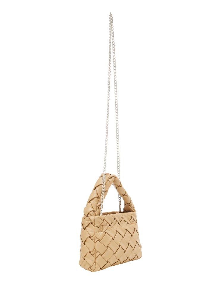 Сумка имеет уникальную тканую текстуру с переплетающимся узором, создающим стеганый эффект. Мягкая, мягкая структура и толстая ручка, также украшенная тем же тканым узором, создают гармоничную эстетику. Ручка перемещается из стороны в сторону и обеспечивает удобный захват для удобной переноски.