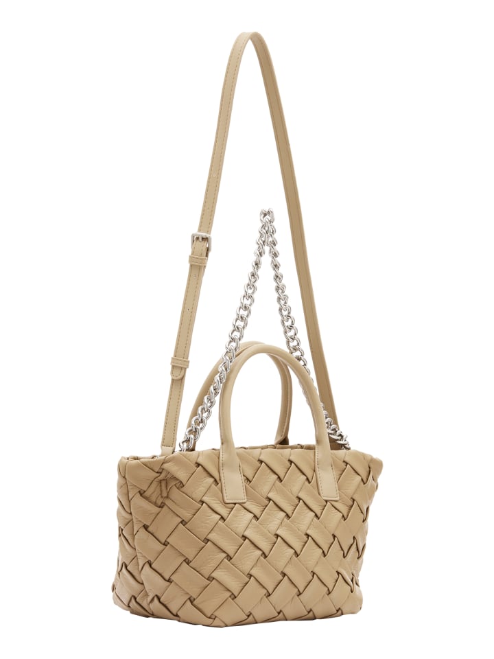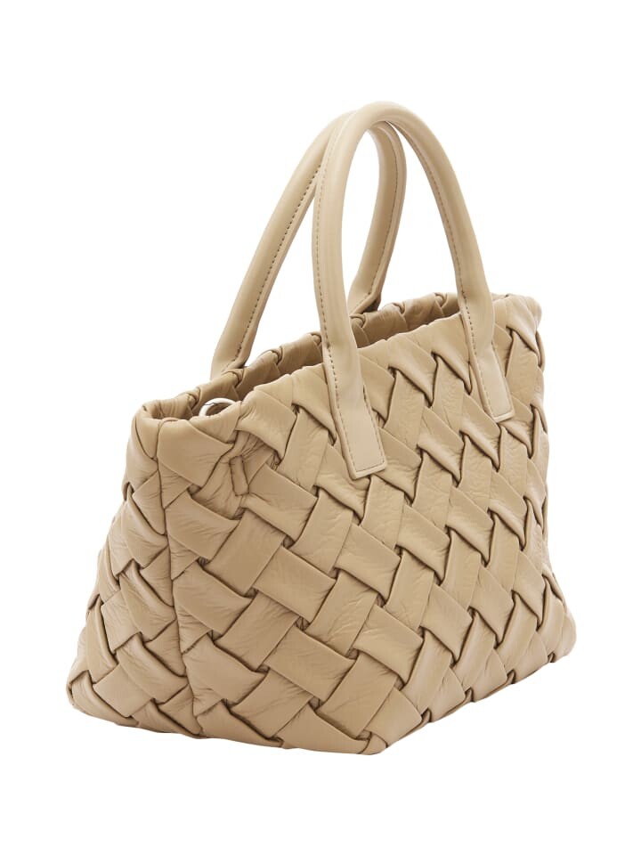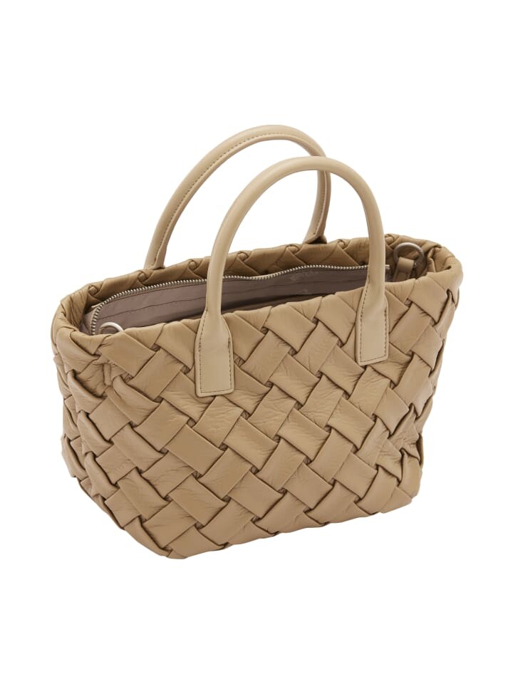 Эта сумка с характерной тканой текстурой, напоминающей корзину, отличается элегантным дизайном, излучающим мастерство ручной работы. Его широкое овальное основание сужается кверху и предлагает просторное основное отделение для всех необходимых вещей. Сумка оснащена двумя прочными ручками, прикрепленными к верхнему краю, для удобного ношения в руке или на предплечье.