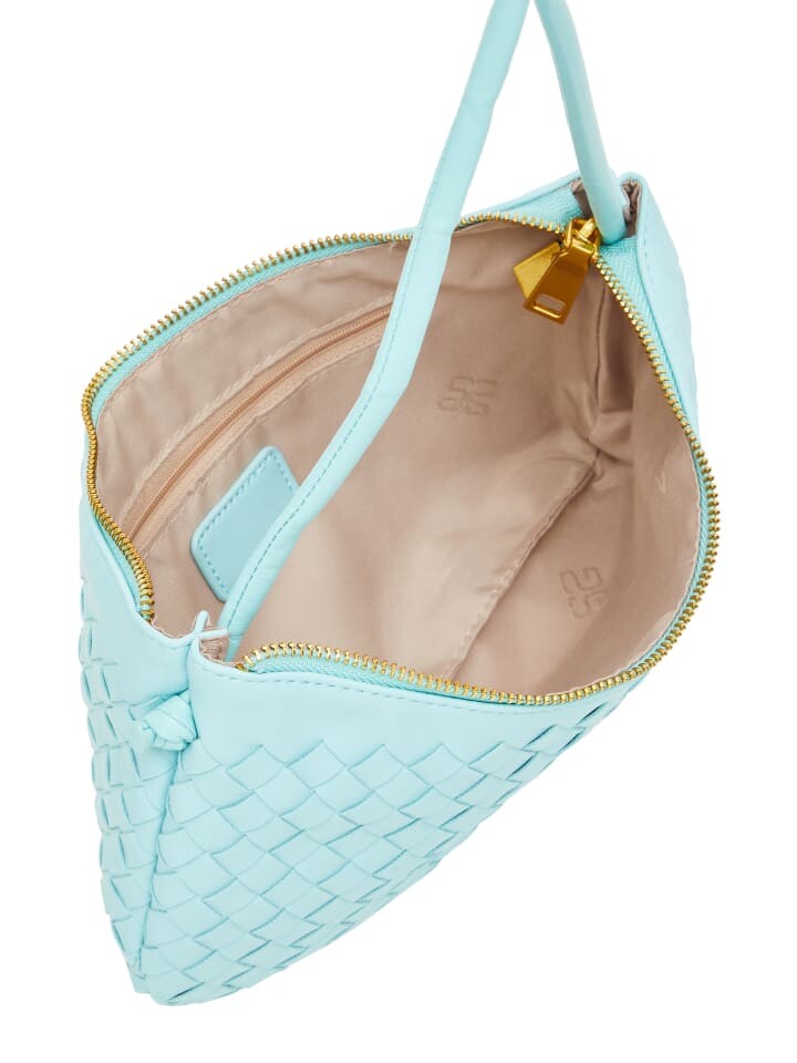 Эта сумка с характерной тканой текстурой снаружи имеет полуцилиндрическую форму с плоским основанием для удобного размещения. Застегивается на молнию и имеет тонкий ремешок, украшенный маленькими узлами и декоративной сферической бусиной. Эта сумка идеально подходит для повседневного использования и воплощает непринужденную элегантность и стиль.