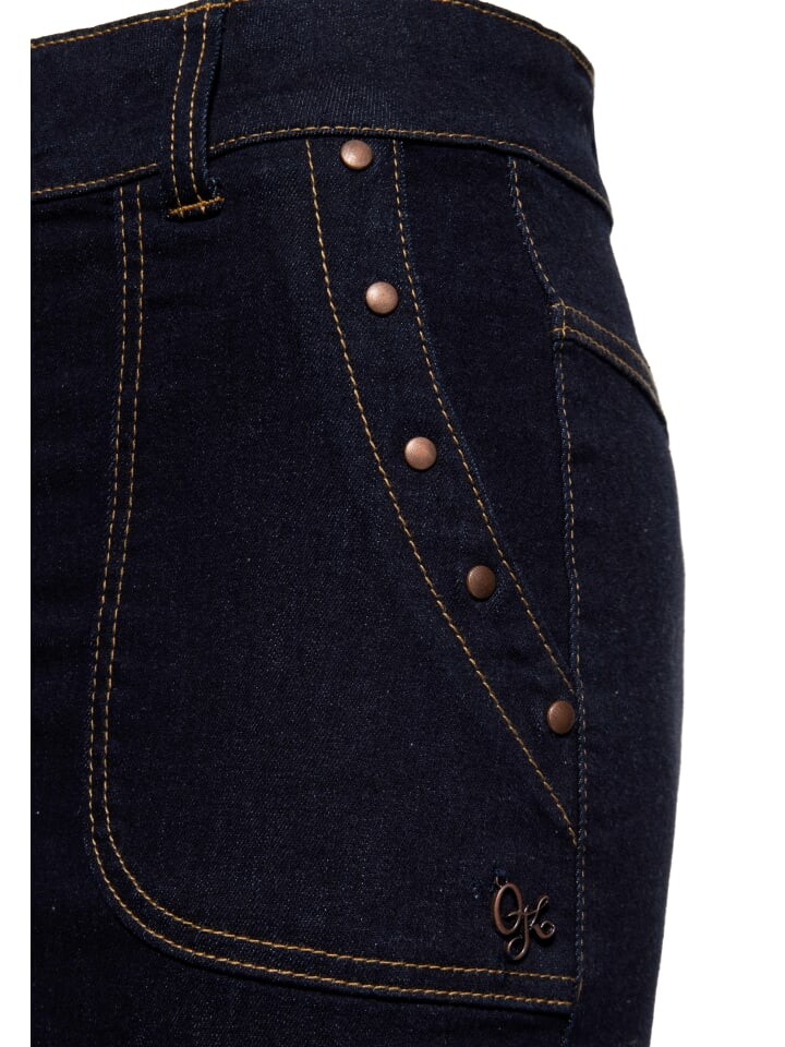 - Тонкий, облегающий фигуру для женственного силуэта. - Контрастная декоративная строчка для придания подлинного шарма в стиле вестерн. - Петли для ремня, а также пуговицы и молнии для идеальной посадки. - Практичные карманы с заклепками и тонкой металлической аппликацией QK. - В сочетании с ковбойскими сапогами для создания характерного образа.