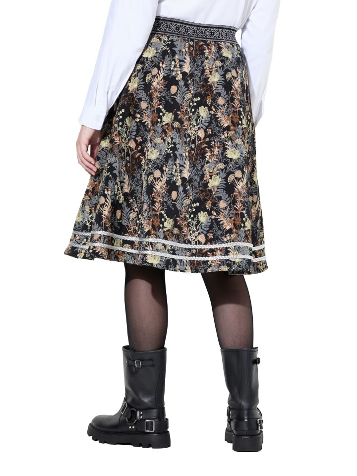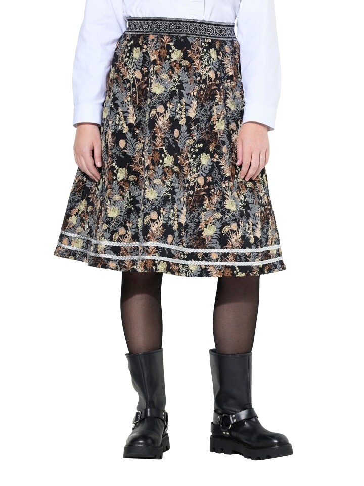 Жаккардовая юбка-миди А-силуэта из высококачественного жаккарда с искусно выплетенным цветочным узором и блестящим шнуром по краю. Декоративный эластичный пояс.