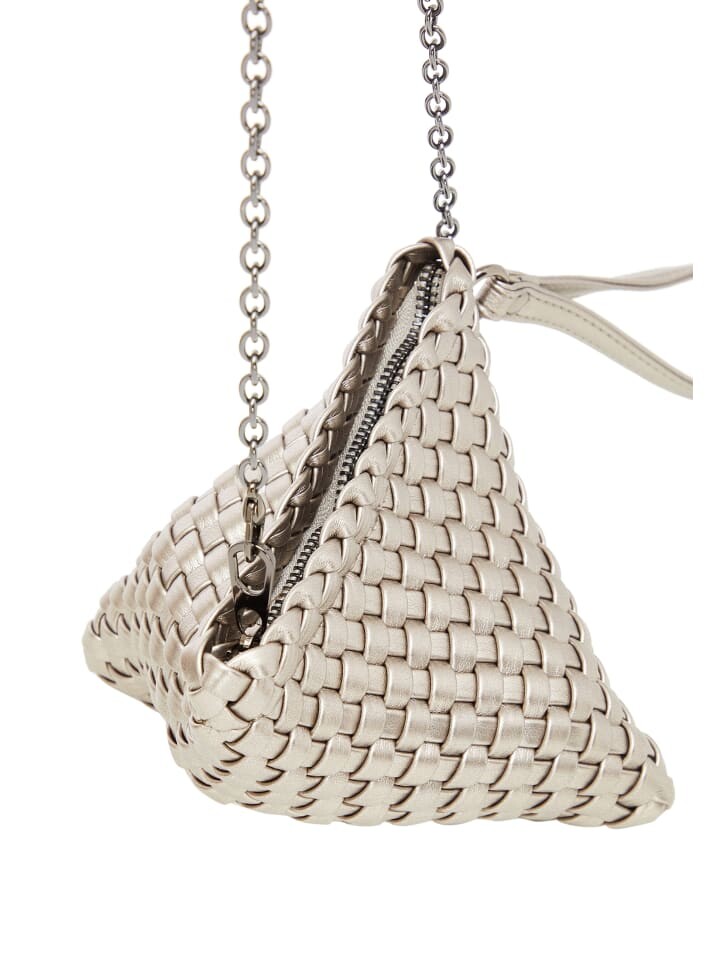 Представляем новинку в коллекции — уникальную сумочку треугольной формы с замысловатыми ткаными деталями. Фактура этой сумки создана искусно переплетающимися полосками, образующими потрясающий узор. Модель оснащена изящным ремешком-цепочкой для универсального ношения на плече или через плечо. Петля сбоку придает всей этой вещи дополнительный стиль. Эта сумка идеально подходит для тех, кто ищет эффектную вещь, излучающую изысканность и искусство.