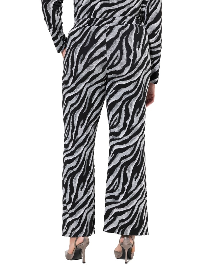 Брюки, слегка расклешенные, с цветным рисунком «зебра» и эластичным поясом.