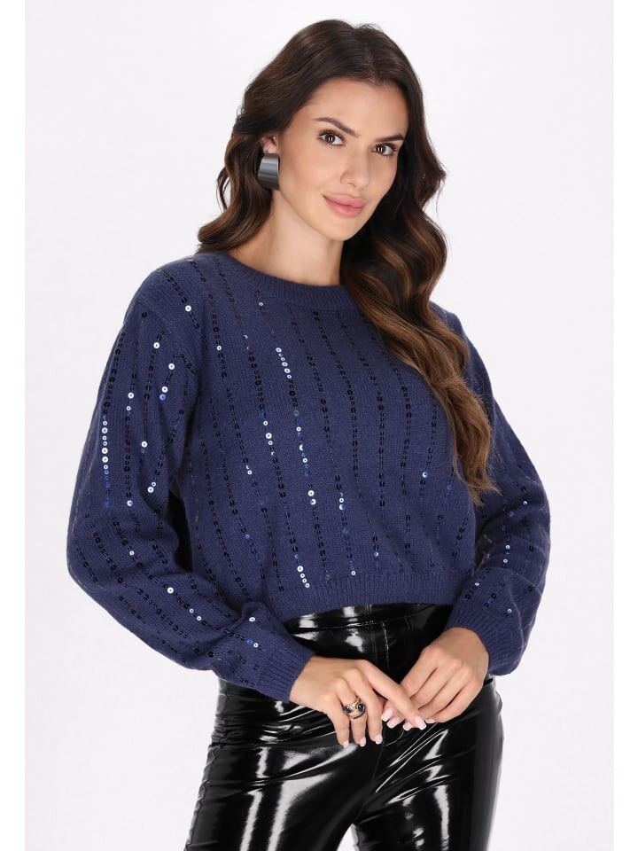 Подчеркните свой стиль с помощью этого шикарного укороченного свитера с длинными рукавами и круглым вырезом. Это современное вязаное изделие, украшенное блестящими пайетками, которые красиво ниспадают каскадом, плотно прилегает к низу и манжетам. Идеально подходит для особых случаев.