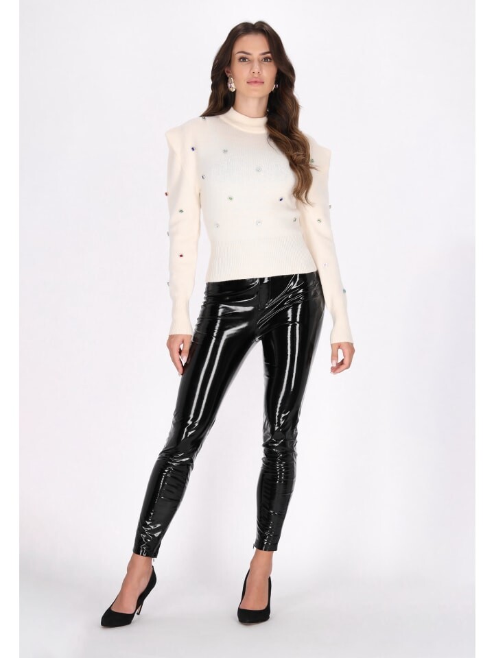 Откройте для себя этот стильный свитер с высоким воротником и ребристой отделкой по краю, манжетам и воротнику. Украшено декоративными украшениями, в том числе круглыми акцентами, искусно расположенными по ткани. Высокий круглый вырез обеспечивает плотную посадку, излучая современную элегантность и шарм. Свитер с длинными рукавами и ребристой манжетой.