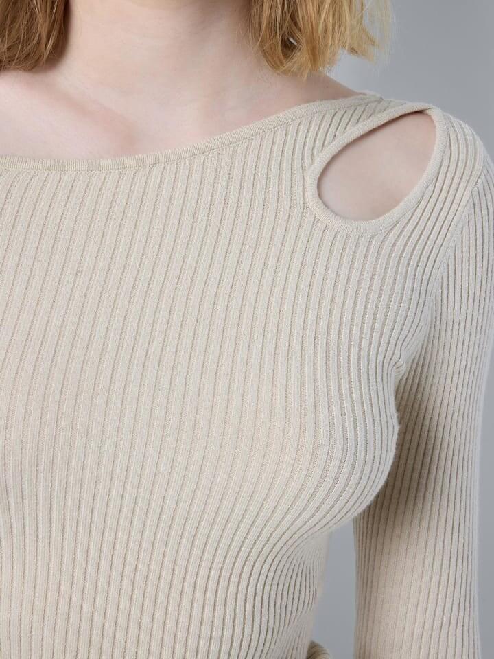 Свитер впечатляет своим облегающим кроем и стильным вырезом на одно плечо.