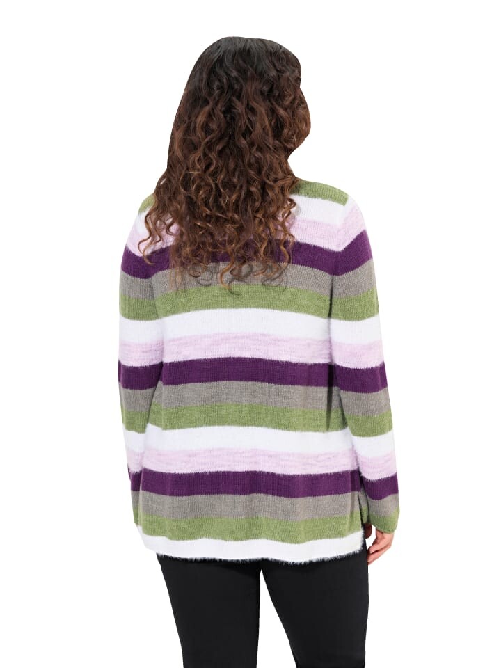 Пуловер А-силуэта выполнен из мягкого трикотажа в полоску. Мягкий воротник-стойка, длинные рукава, закругленный низ, сзади примерно на 4 см длиннее, с боковыми разрезами.