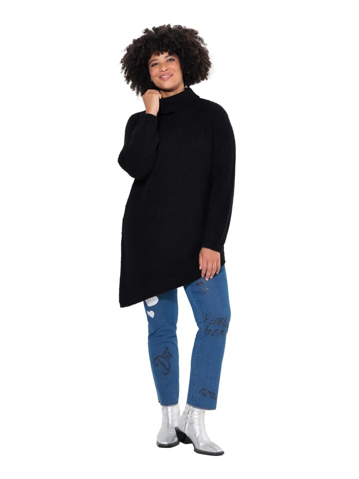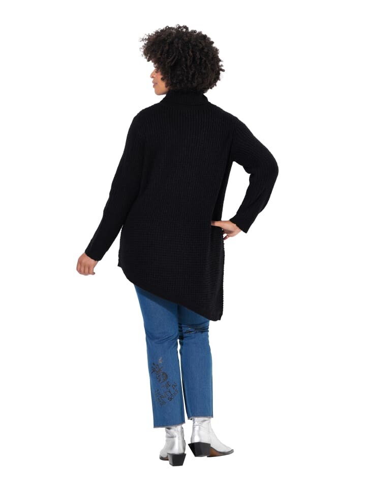 Пуловер прямого кроя из мягкого структурированного смесового трикотажа с асимметричным заостренным краем. Воротник стойка, длинные рукава с ребристыми манжетами.