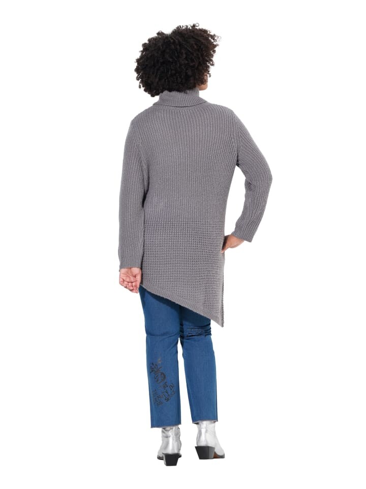 Пуловер прямого кроя из мягкого структурированного смесового трикотажа с асимметричным заостренным краем. Воротник стойка, длинные рукава с ребристыми манжетами.