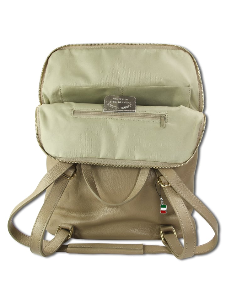 Современный женский рюкзак из натуральной мягкой телячьей кожи - Производство Италия. Этот стильный рюкзак вмещает все необходимое и идеально подходит для города и отдыха. Вы можете удобно и удобно хранить свою посуду во многих карманах. В комплект поставки входит небольшой кулон «Италия», который можно носить на изделии или как брелок для мобильного телефона.