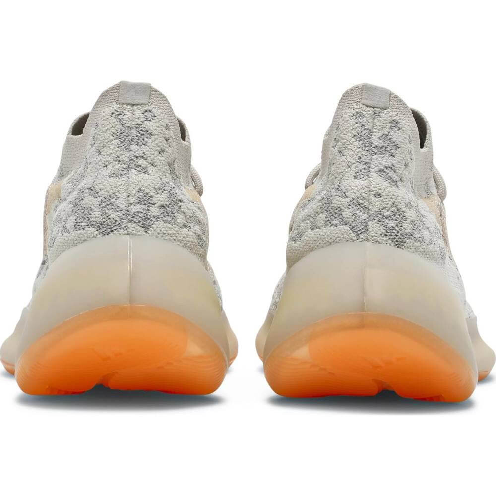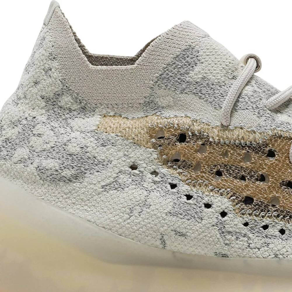 Adidas Yeezy Boost 380 Yecoraite имеет гибкий верх Primeknit, украшенный камуфляжным рисунком, состоящим из волокон нейтрального серого и не совсем белого цвета. Минималистичная конструкция в виде носка украшена декоративными шнурками и полупрозрачным окном из моноволокна бледно-оранжевого оттенка. Чувствительная амортизация обеспечивается межподошвой Boost во всю длину, покрытой полупрозрачной резиной для повышения устойчивости и долговечности. На резиновую подошву с узором «елочка» нанесена тонкая коралловая отделка.
