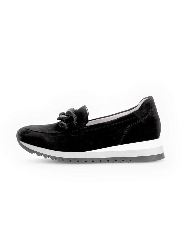 Тапочки популярного модного бренда Gabor относятся к всесезонной классике и должны быть найдены в каждом обувном шкафу у женщин, следящих за модой. Черный верх из текстурированной замши придает этим полуботинкам неповторимый вид. Ширина обуви F означает, что полуботинки идеально подходят для женщин с узкой и нормальной стопой. Благодаря оптимальной посадке пользователь получает более широкую зону протектора в области мяча и больший комфорт. Модель оснащена съемной стелькой, которую можно легко заменить на ортопедические стельки.