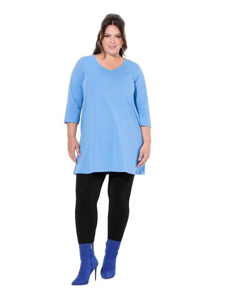 Длинная рубашка А-силуэта с декоративной строчкой. V-образный вырез, рукава 3/4. Удобный широкий низ.