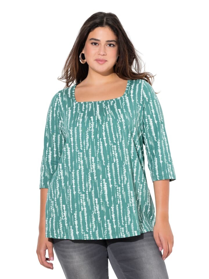 Футболка А-силуэта из мягкого трикотажа с принтом по всей поверхности. Квадратный вырез горловины с декоративными складками, рукава 3/4.