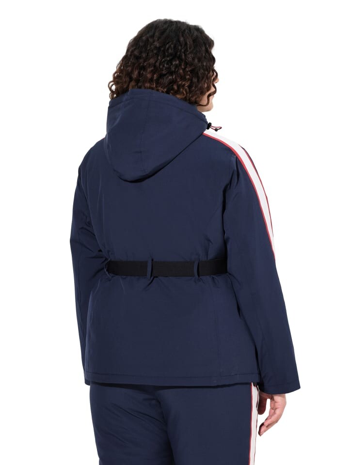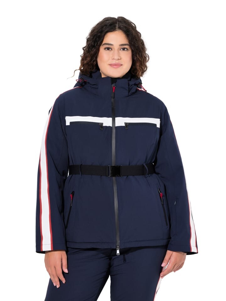 Спортивная куртка с цветными полосками, поясом на талии и регулируемым капюшоном. Тройная функция: водонепроницаемость (водяной столб 5000 мм), ветрозащита, воздухопроницаемость. Дополнительно водоотталкивающий благодаря бесфтористому покрытию, все швы проварены. Двусторонняя молния, карманы на молнии. Рукава с застежками-липучками, ветрозащитой и отверстием для большого пальца. Подол с кулиской. Теплая подкладка со снегозадержателем и практичными карманами.