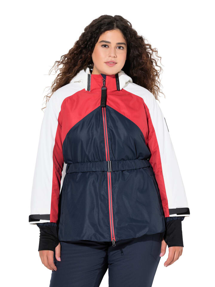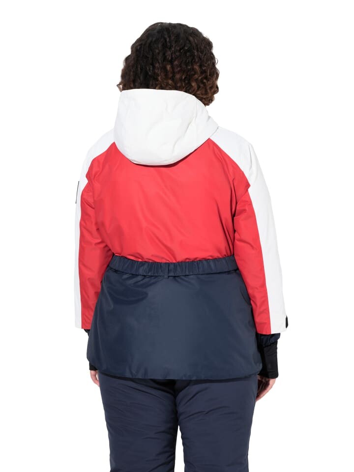 Функциональный жакет с колор-блоками и ярким акцентом: баской по низу. Капюшон на молнии, пояс на талии. Тройная функция: водонепроницаемость (10 000 мм водного столба), ветрозащита, воздухопроницаемость (5 000 г/кв.м/24 часа). Дополнительно водоотталкивающий благодаря бесфтористому покрытию, все швы проварены. Водонепроницаемая двусторонняя молния, 2 кармана на молнии. Рукава с застежками-липучками, ветрозащитой и отверстием для большого пальца. Теплая подкладка со съемной снежной юбкой и практичными карманами.