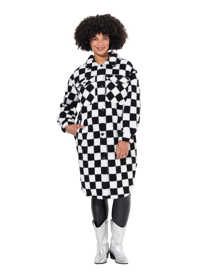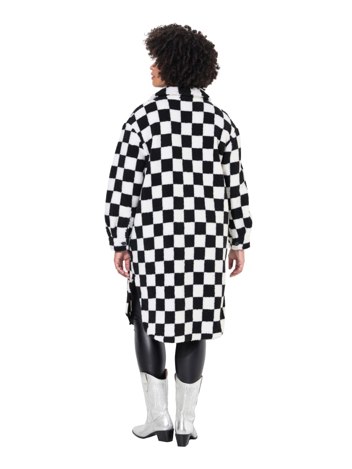 Куртка-рубашка длинного А-силуэта из плюша тедди с шахматным узором. Воротник с лацканами, слегка заниженная линия плеча, нагрудные карманы, закругленный низ. Длинный рукав с манжетами.