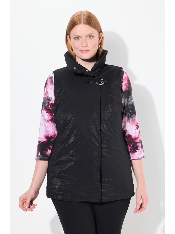 Жилет классического кроя, легкий и согревающий. Изюминка: декоративная застежка над потайной молнией. Воротник-стойка, согревающий шею, изящные карманы в швах. Высококачественная цельная подкладка.
