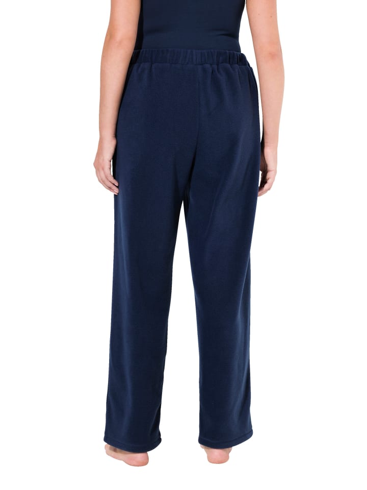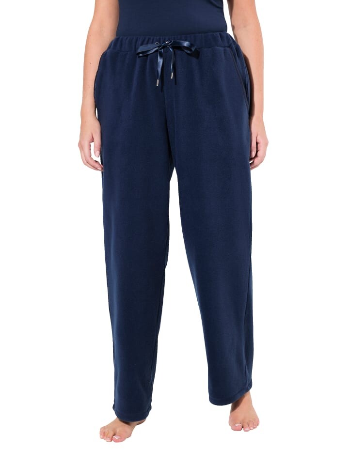 Флисовые брюки для дома, прямого кроя, с эластичным поясом и атласным завязком. Боковые карманы с мерцающей атласной окантовкой.
