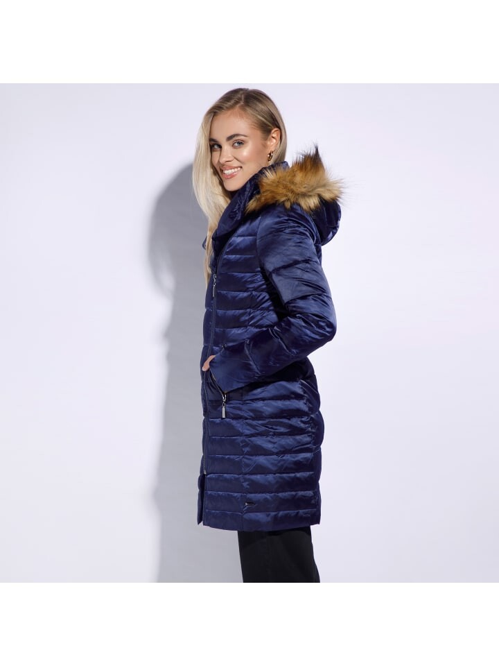 Стильная женская куртка изготовлена из приятного на ощупь, слегка блестящего нейлона. Капюшон отделан искусственным мехом. Наполнитель из натурального пуха согреет вас в самые холодные дни. Смещенная от центра застежка-молния и стеганые вставки придают модели шикарный и модный вид. Благодаря легкому утеплителю из пуха и пера и гладкому капюшону с меховой отделкой он станет стильным способом пережить зимнюю стужу.