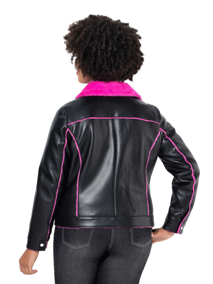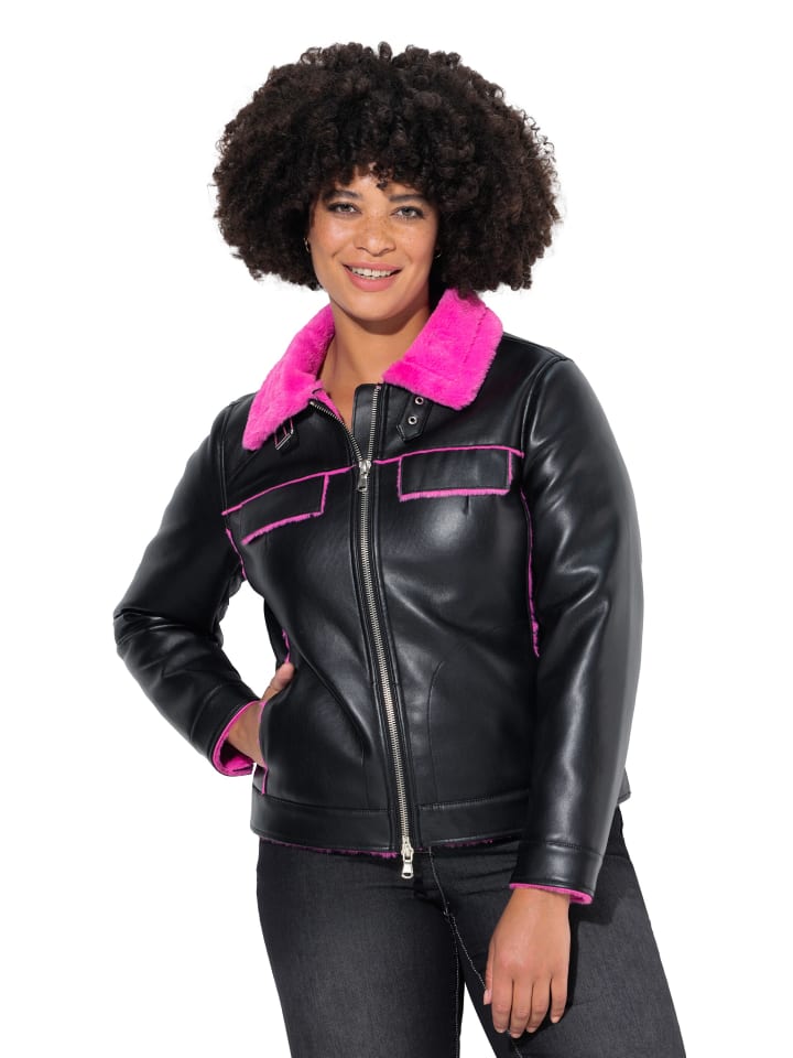 Кожаная куртка классического кроя, на подкладке из неонового искусственного меха, заметной на воротнике и швах. Воротник рубашки, молния, карманы с клапанами. Длинный рукав.