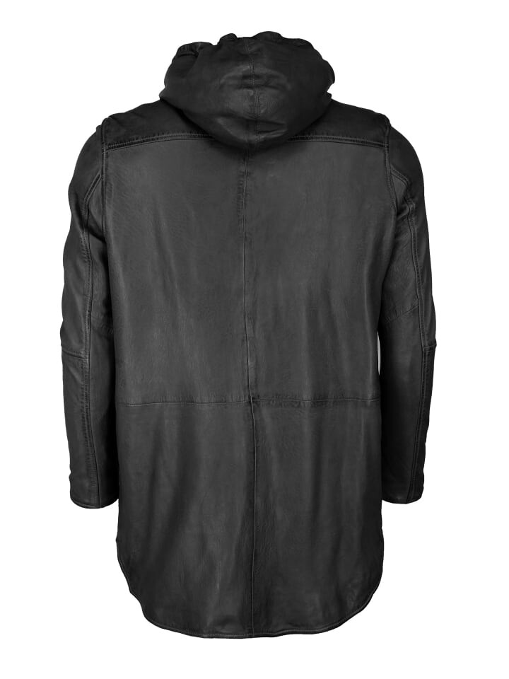 Современное кожаное пальто от модного бренда MAZE. На пальто двойная молния с двумя вертикальными боковыми карманами. Слегка адаптированный крой гарантирует оптимальную посадку и высокий уровень комфорта. Пальто имеет приятную мягкую внутреннюю подкладку и эластичный капюшон. Куртка приобретает особенный вид благодаря тонким декоративным швам.