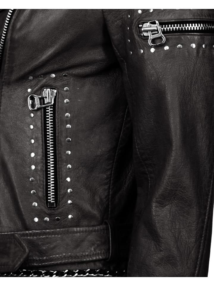 Роковая байкерская куртка от модного бренда MAZE. Куртка имеет асимметричную молнию с широким рубашечным воротником. Куртка также оснащена двумя боковыми карманами на молнии, нагрудным карманом и внутренним карманом. Слегка адаптированный крой гарантирует оптимальную посадку и высокий уровень комфорта. Надежно прикрепленный набедренный ремень обеспечивает хорошую фиксацию. Абсолютной изюминкой куртки являются многочисленные цепочки, заклепки и молнии.