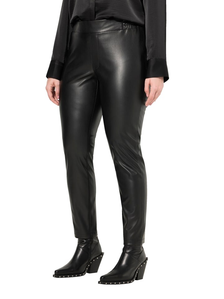 Брюки из искусственной кожи, облегающего кроя, узкие и эластичные. Эластичный пояс с ложной молнией.