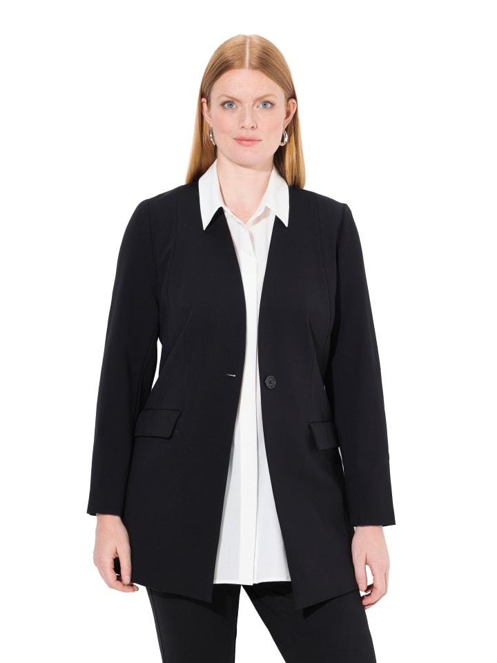Блейзер Punto классического кроя из тонкого трикотажа Punto di Roma. Новый образ – V-образный вырез вместо лацканов. Застежка на пуговицы, карманы с клапанами, длинные рукава. Высококачественная подкладка для идеального комфорта.