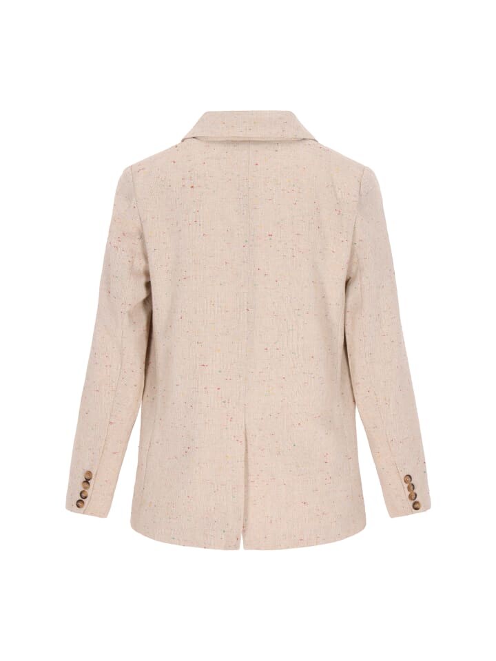 Подчеркните свой стиль с помощью этого элегантного пиджака, созданного для современной женщины. Свободный крой, воротник с лацканами и двубортные пуговицы сочетают в себе шик и комфорт. Длинные рукава подчеркивают шикарный вид, а практичные карманы повышают функциональность. Изготовленное из ткани с акцентами из разноцветных ниток, оно идеально вписывается в любую коллекцию модных стилей. Это часть коллекции Fashion Look.