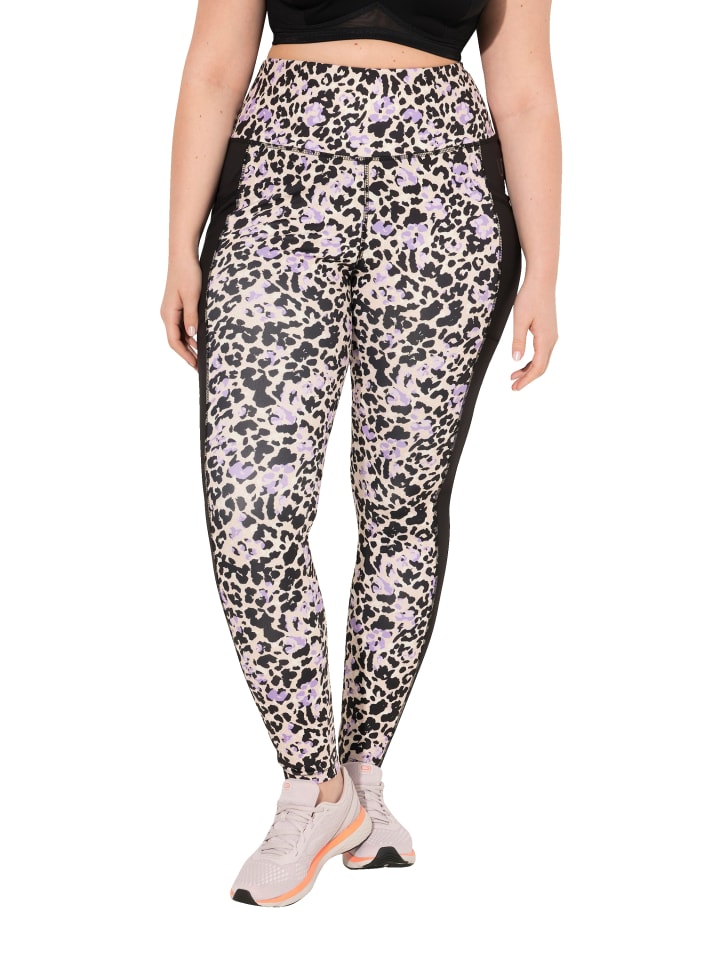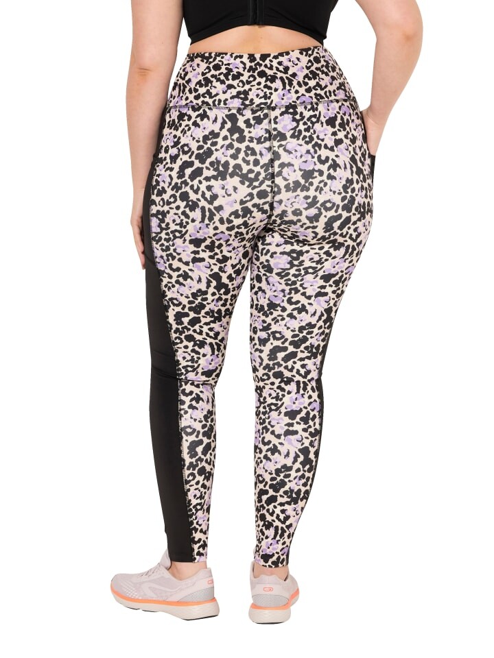 Спортивные леггинсы с леопардовым узором и однотонными вставками по бокам. Изготовлен из переработанного полиэстера, QuickDry, дышащий. Высокая талия, приятный широкий эластичный пояс и боковые карманы. Отсутствие боковых швов снаружи – меньше трения, высокий комфорт при ношении и движении.