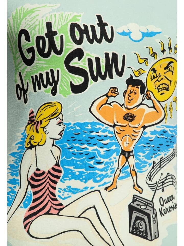 Уйди от моего солнца, малышка! В этой футболке Queen Kerosin очаровательно и дерзко перенесет образ жизни 50-х прямо в ваш дом. Яркий винтажный принт спереди и эффектная надпись делают его обязательным элементом вашей коллекции Rockabella. Облегающий крой в сочетании с эластичным трикотажным полотном из высококачественной смеси хлопка и эластана также обеспечивает удобство и оптимальный комфорт при ношении, что оптимально дополняется приятным ощущением на коже и комфортом при ношении даже в теплые дни. Короткие рукава и классический круглый вырез завершают повседневный женственный образ. Быстро приобретите неповторимый стиль и пополните свой винтажный гардероб. Аутентичное базовое универсальное сочетание с особым дополнением.Футболка с короткими рукавами от Queen KerosinKesser Эффектный принт спереди в винтажном дизайне Облегающий крой по фигуреКлассический круглый вырез Оптимальный комфорт при ношении благодаря высококачественному хлопку