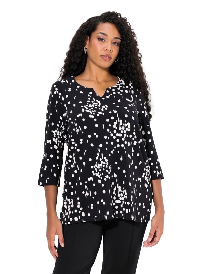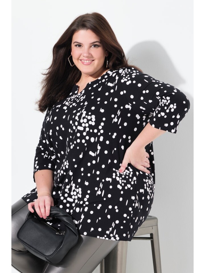 Футболка классического кроя из мягкого трикотажа с узором в горошек. Вырез туники, рукава 3/4.