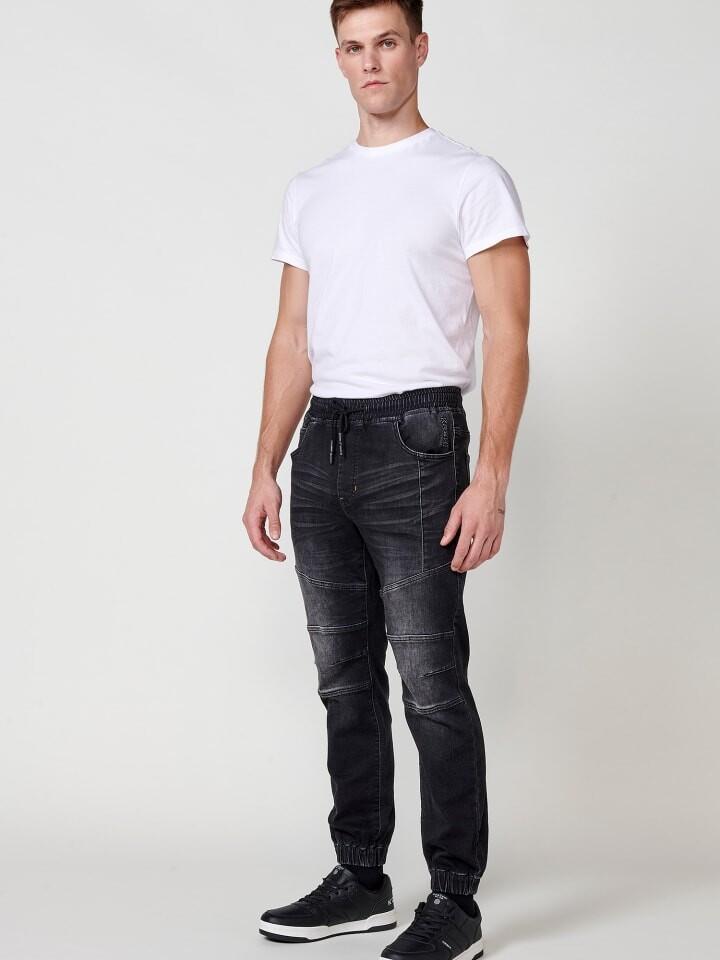 Джинсовые брюки-джоггеры. Эластичный пояс. Пять карманов, один карман для монет. Детали колена. Состав 75% хлопок 24% полиэстер 1% эластан.